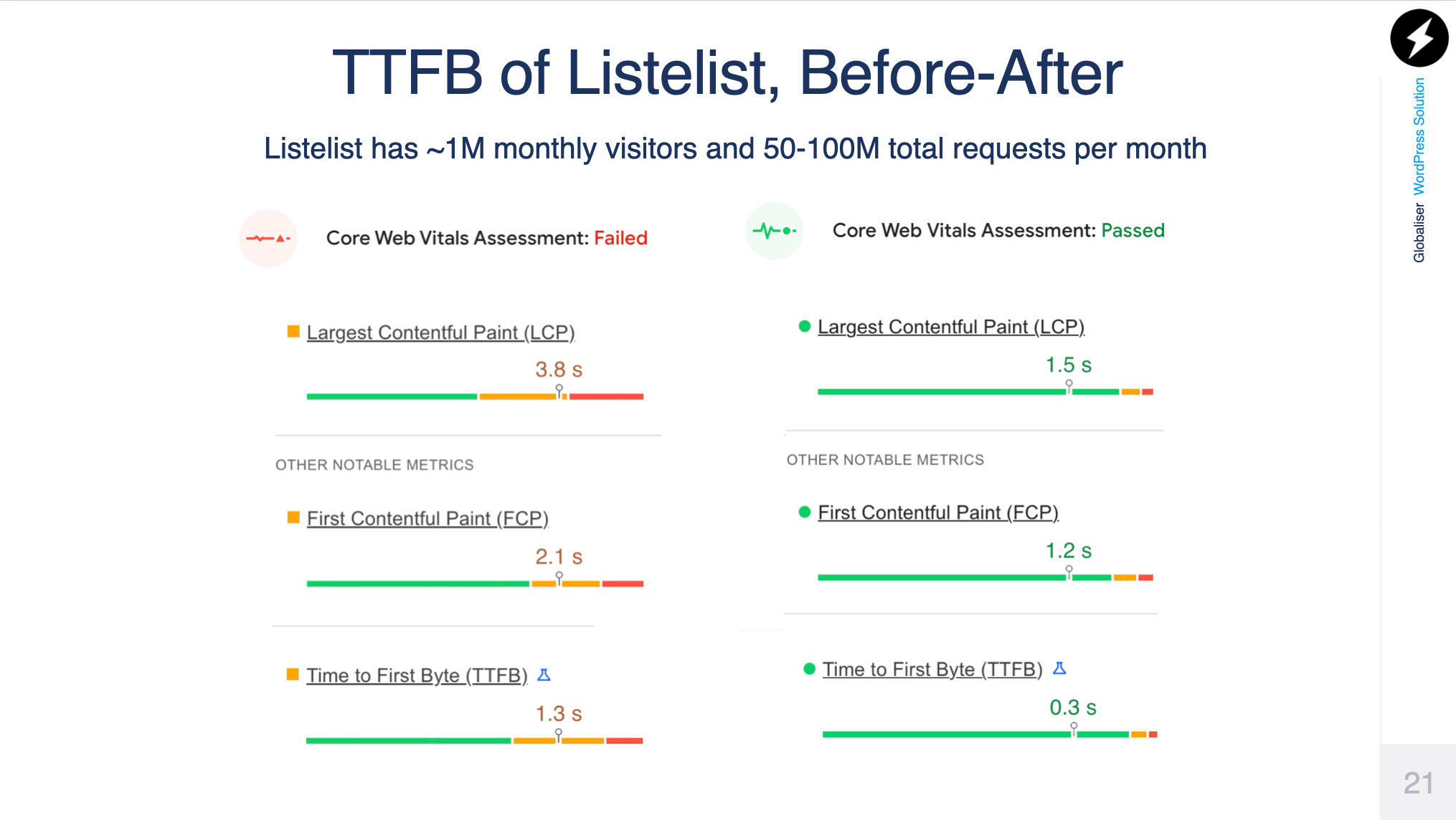 Time to First Byte measures how fast your server responds. Traditional WordPress: 500ms-2s. EnterpriseWP: under 100ms. Globally.