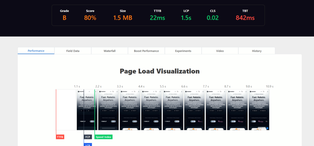 Finally, we tested Globaliser, and the difference was striking. The TTFB came in at just 22 ms, one of the fastest results possible in these tests. More importantly, this server efficiency translated into real-world speed: the LCP was only 1.5 seconds, and the overall score reached 80% (Grade B). What makes this result particularly interesting is how it compares to even large-scale platforms like Google. In our tests, Globaliser actually delivered a faster LCP and higher overall score, showing that infrastructure-level optimizations can have a real impact regardless of company size. While WP Engine and Kinsta showed strong TTFB numbers but weaker LCP, Globaliser demonstrated that both ends of the performance spectrum can be optimized together. showing how effective infrastructure-level optimizations can improve TTFB WordPress sites for any traffic scenario.