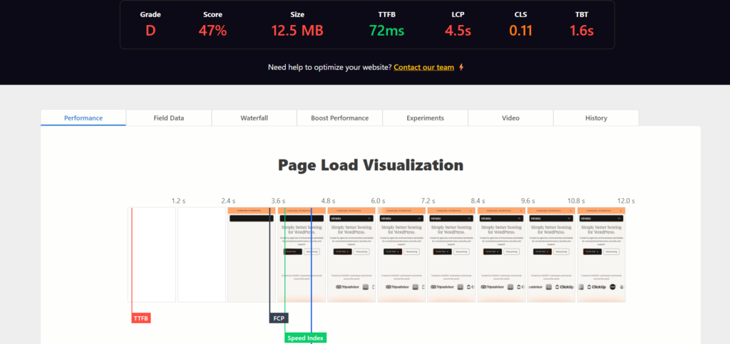 With Kinsta, the results looked slightly better. The TTFB was 72 ms, which on paper is excellent. But again, the weak point was the LCP, which dragged on to 4.5 seconds. The overall performance score reflected this imbalance, landing at 47% (Grade D). This shows an important reality: a good TTFB alone doesn’t guarantee fast websites. If the rest of the content pipeline is inefficient, users still end up frustrated, no matter how quickly the first byte arrives. To truly improve TTFB WordPress performance, optimizing both the server and the content pipeline is essential. Testing with tools to check TTFB online can help pinpoint where bottlenecks occur.