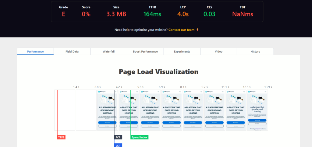When we tested WP Engine on SpeedVitals, time to first byte (TTFB) came in at 164 ms – not bad on the surface, since anything under 200 ms is generally considered fast. However, the overall performance score was a shocking 0% (Grade E), mainly because the Largest Contentful Paint (LCP) -the time it takes for the largest visible element on the page to load- stretched to 4.0 seconds. This shows that even with a decent TTFB, server efficiency alone does not reduce server response times enough to make the site feel fast. Visitors still had to wait too long before the page became usable, highlighting why measuring TTFB is just one part of the picture.