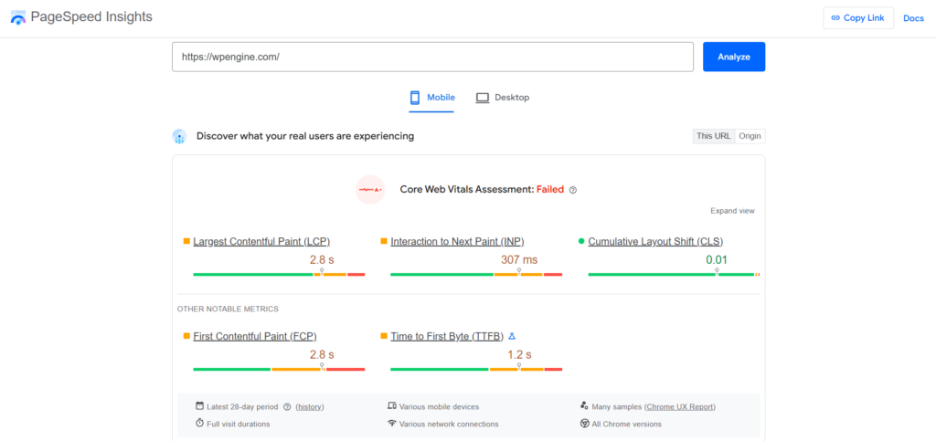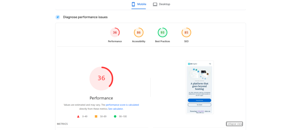 The lesson here is that no single tool gives the full picture. SpeedVitals highlights the infrastructure side, while PageSpeed Insights adds the real-world perspective. In WP Engine’s case, both sets of results point to the same underlying issue: the server is holding back performance, whether you look at it from a synthetic or field-data angle.