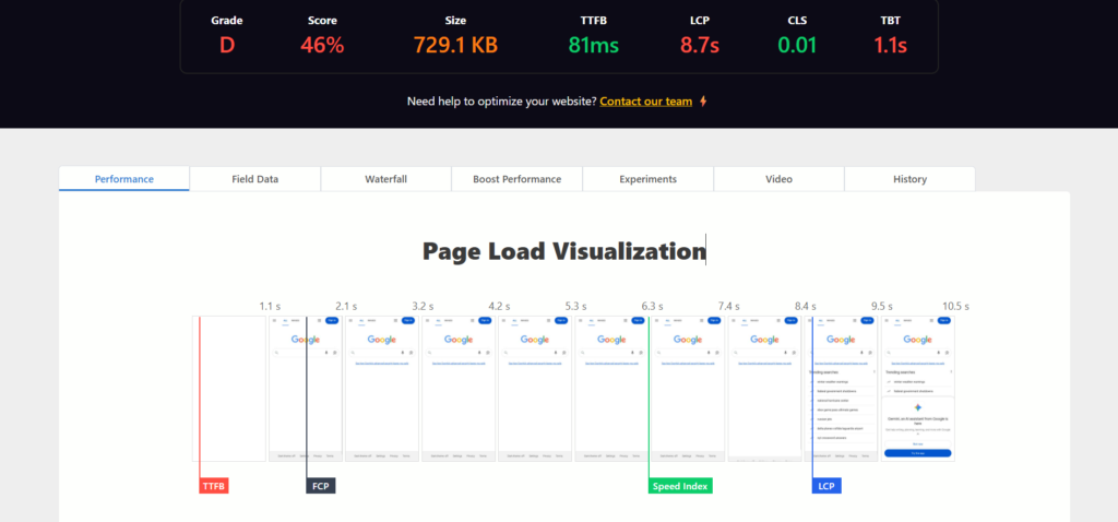 When we tested Google, the TTFB came in at 81 ms – very solid and within the “fast” range. But the overall performance score told a different story: just 46% (Grade D). The main issue was the Largest Contentful Paint (LCP), which took a surprising 8.7 seconds to complete. That’s almost double the wait time we saw on other providers, and it means users don’t actually see meaningful content until much later. This highlights a key point: even the biggest platforms aren’t immune to performance trade-offs.