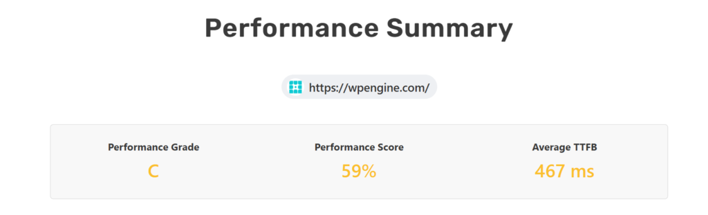 When we tested WP Engine’s global performance, the platform earned a Performance Grade of C with an overall score of 59% and an average TTFB (Time to First Byte) of 467 ms. While this TTFB is within an acceptable range for many websites, it suggests room for improvement — especially for audiences outside of North America and Western Europe. The global test map reveals a noticeable variation in response times: green and yellow markers across Europe and the U.S. indicate relatively fast server responses, whereas red markers in regions such as East Asia, Australia, and Southern Africa highlight slower delivery speeds. This uneven distribution shows that WP Engine performs best near its primary data centers but can experience latency when accessed from more distant regions.